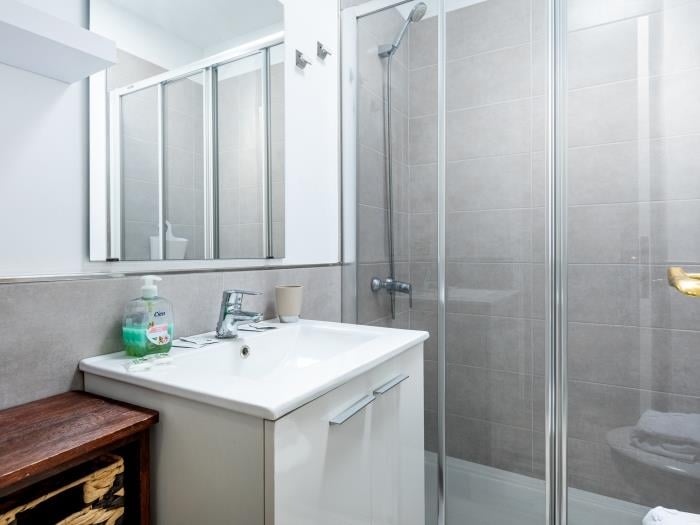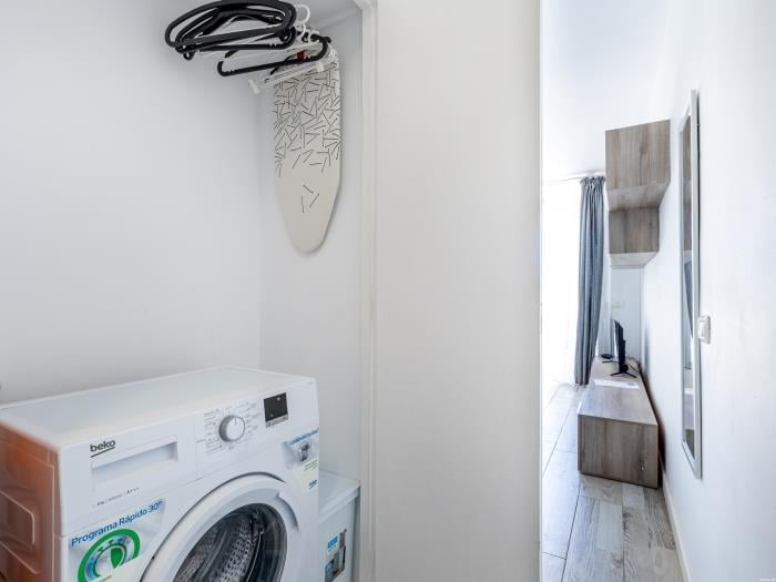 soggiorno, inclusa una lavatrice per una maggiore comodità, e il bagno dispone di una moderna doccia per un comfort extra.